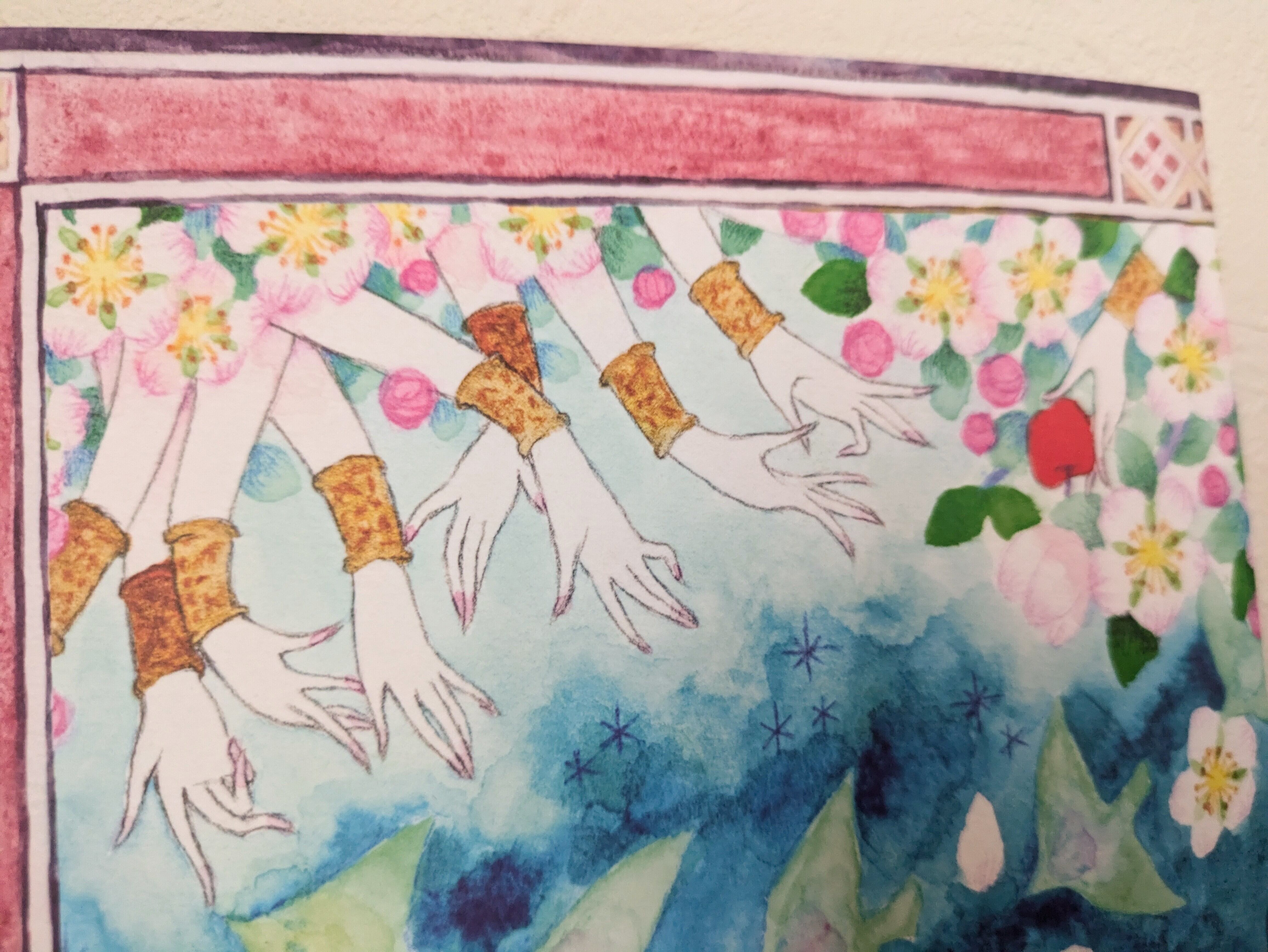 眠りに落ちた王子が目覚めると、林檎の花が咲きこぼれる銀の枝があります。